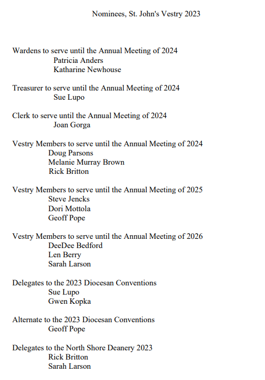 Join St. John's on Sunday, January 29 at 10:45am after church services for the annual meeting to discuss what happened in 2022 and elect new vestry members for 2023. Join in person or over Zoom.